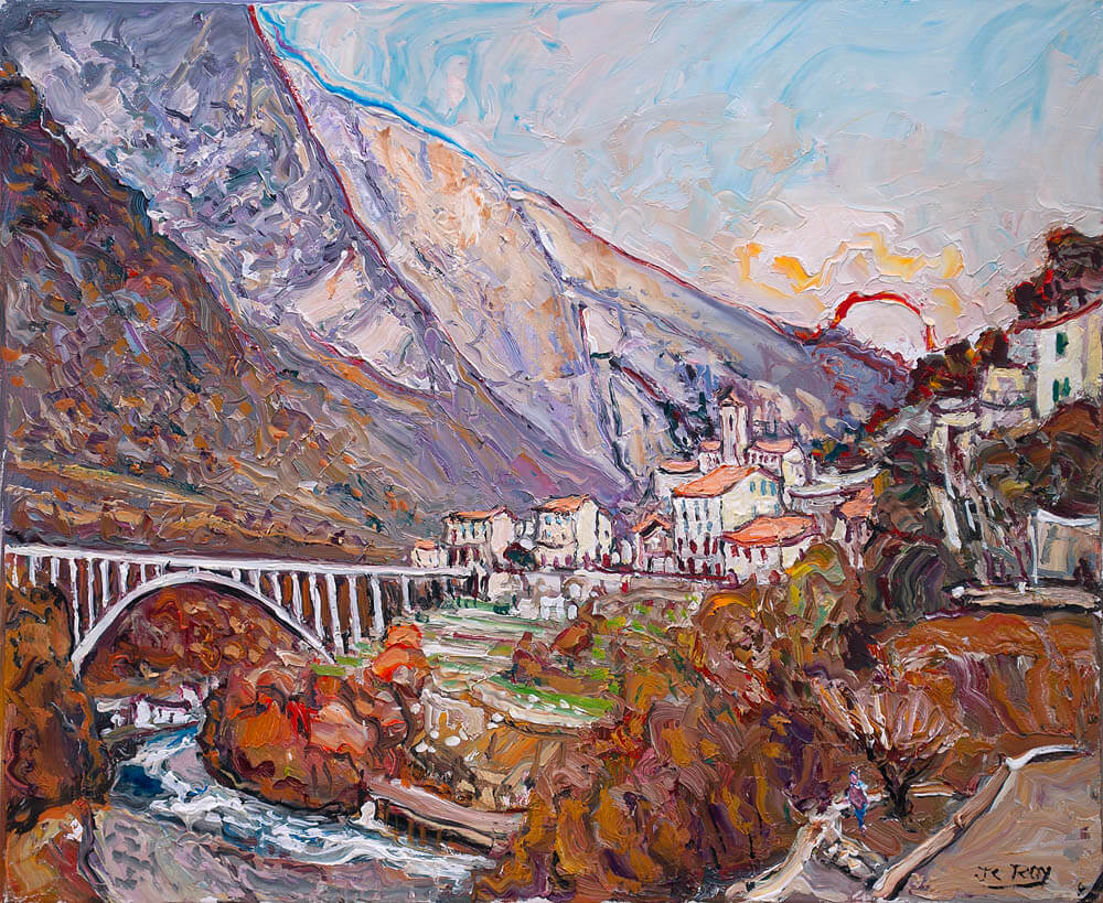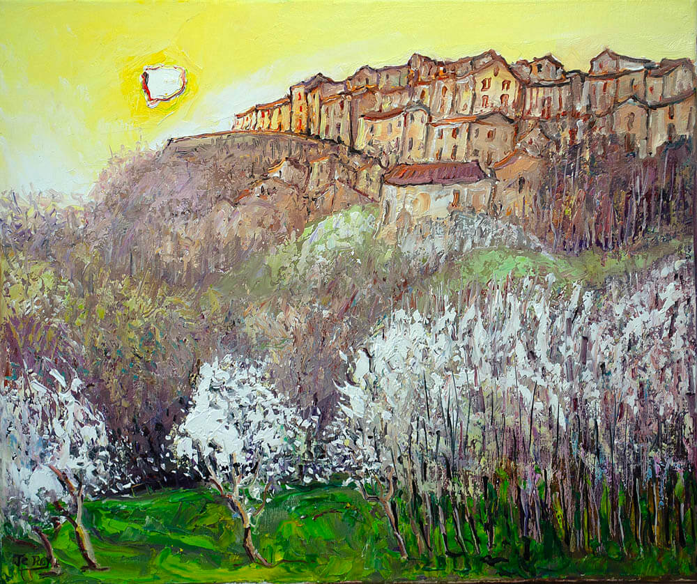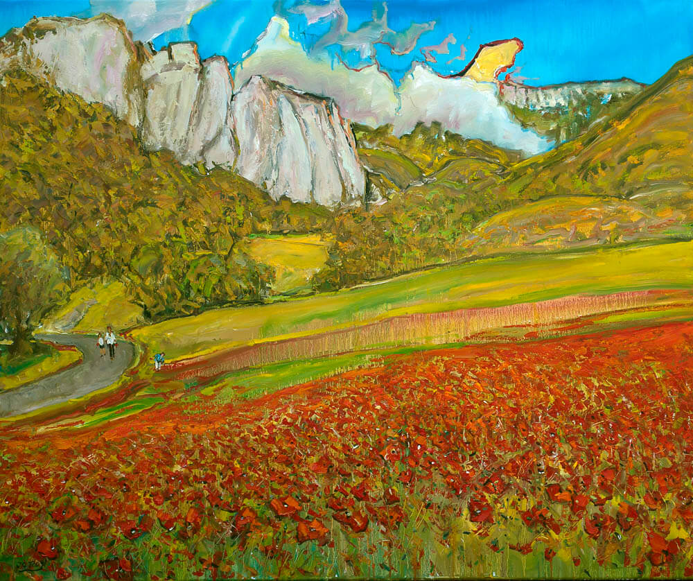 He is a prolific artist by any measure; he loves working with the local stone of his region, and the stone walls that surround his property are works of art themselves, with "low income housing" for birds, sculptures made of the tools of his former trade and fruit trees which he grafts himself and trains over the face of the walls. He is also one of the uncommon painters who prefers to work outdoors, and has frequently done so in freezing weather. He paints every day, and often finds himself in the evening re-living a drive through the countryside, choosing a spot for the next day. By the time he arrives to do the painting, he says, most of the work of composition and color has already been done and there remains the relatively quick job of putting the paint on canvas.